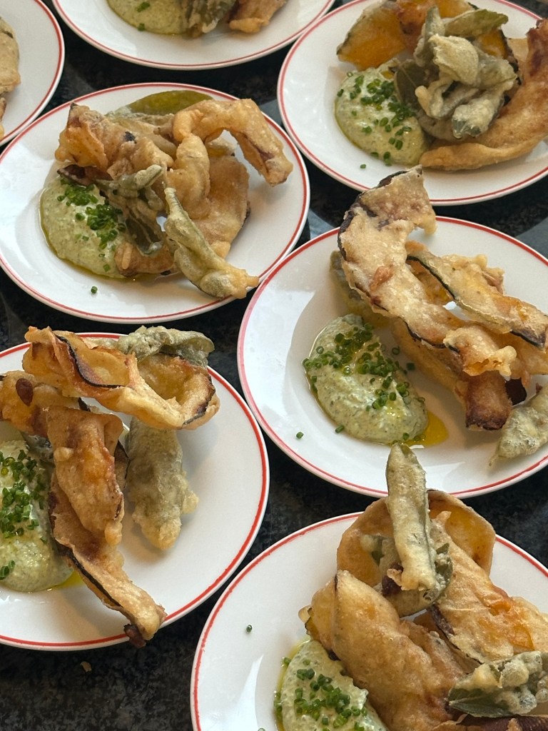 – Glaserade morötter med färskostkräm smaksatt med karamelliserad lök, confit vitlök och saltad citron, toppas med nötkrisp